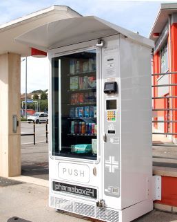 Il distributore, situato all'esterno della farmacia, consente l’acquisto in autonomia di una selezione di prodotti da banco per le piccole urgenze, articoli stagionali (come prodotti contro le allergie, sintomi da raffreddamento, protezione solare, ecc.), prodotti per bambini e articoli per la sfera intima.